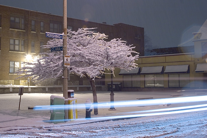 Timed exposure. Started taking the photo while the car was still in the frame, and the car drove out as the photo was being exposed. Since the car wasn’t bright enough to show up, only the headlights are visible.